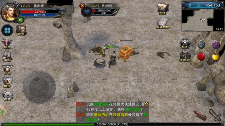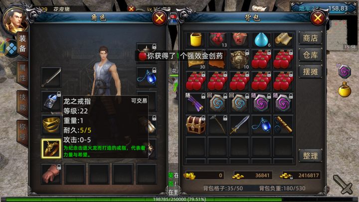 战力提升之后我们就进入到副本了,点击右边的老兵开始打怪升级爆装备。副本里有精英怪、变异怪、Boss、还有宝箱和矿石等等。我们先进入低级副本,这里小编选择的是地穴副本,刷着刷着看到一个玛法宝箱,开启宝箱需要20分钟(这段时间不能离开副本、死亡、闪退都会使宝箱掉落),小编一边挂机刷怪一边等待着宝箱开启,最后两分钟突然被其他玩家追着砍,一边跑一边嗑药,最终还是开到了宝箱,获得了龙之戒指(攻击0~5)前期相当不错的装备了。