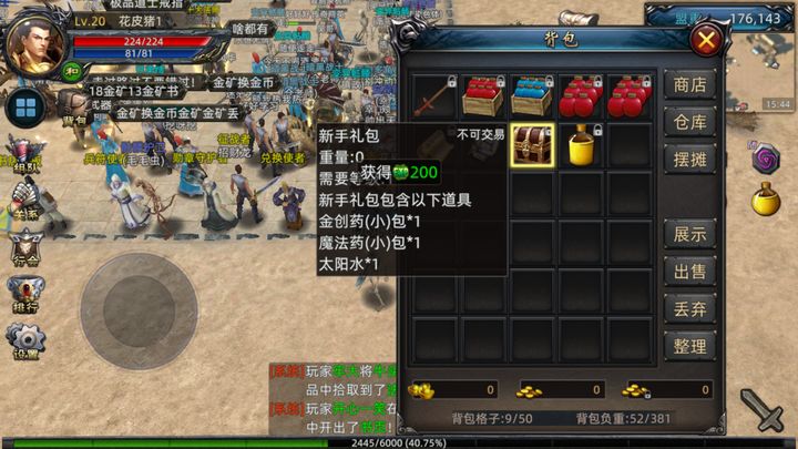 我们点击旁边的老村长进入到盟重,可以看到有很多的NPC。我们在盟重每5秒可以获得200经验,很快我们就可以升到20级打开背包里的新手礼包,穿戴系统给予的装备和技能书提升自己的战力,还可以找到兑换使者兑换礼包码义战龙城-3D纯净服礼包码(新手礼包VIP666、关注礼包VIP777、成长礼包VIP888)获得大量金币。