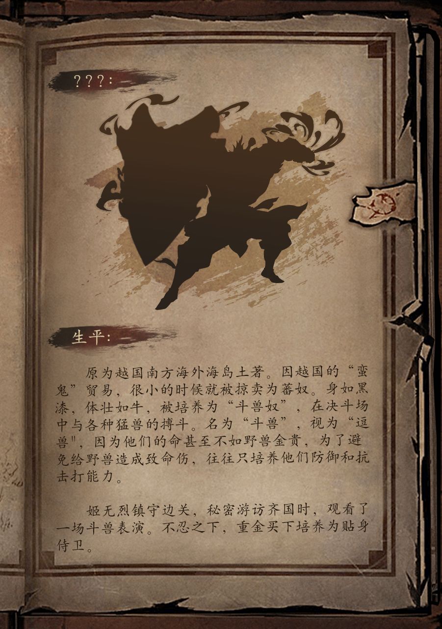 本周又一残卷,还请劳烦继续补全见闻录残缺处。据说此位侠客,身黑如漆、体壮如牛。曾被培养为【斗兽奴】,后被一名神秘的贵族男子买下。小昭到时听说过这类表演,专为当地有钱有权的各界人物准备的娱乐活动,是一场极为残忍的表演!涤罪师大人可以根据描述及图片填补出是哪位侠客!报酬小昭定在三日之后送至各位涤罪师大人手中,祝大人万事亨通!