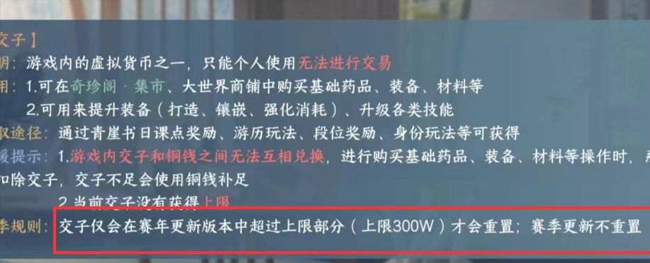 1、交子:新赛季会有装备需要强化,玉石需要升级,到时候都需要消耗大量交子。