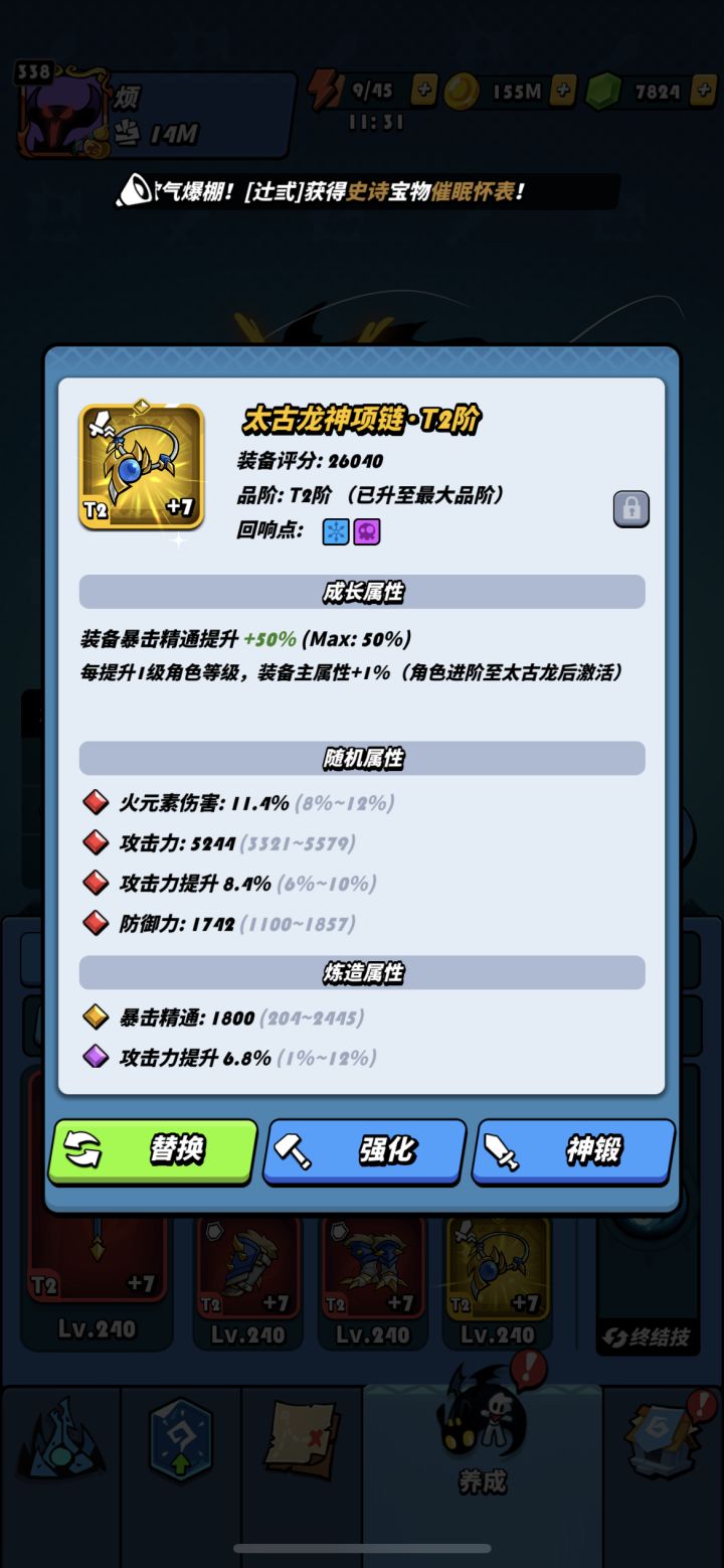 而外补充,回响点用史诗洗炼石必定出2个回响点,卓越一般为一,炼造一套t2对于大部分玩家普遍战力能加2000k往上,一件极品t2会不会是你成道的道器呢