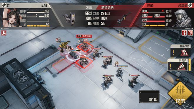 那么为了一次战斗就可以完成所有成就,大家可以这么安排(这关会有一定的随机度,例如白月的攻击部位,虹是否闪避等,以下思路维一尽可能的避免了随机性的干扰),第1回合依次用西尔维娅的1AP技能点中间超适体敌人的头,然后用虹的升龙,最后用白月的【碎月】了解这个敌人,接着第1回合按照上图中的站位结束。