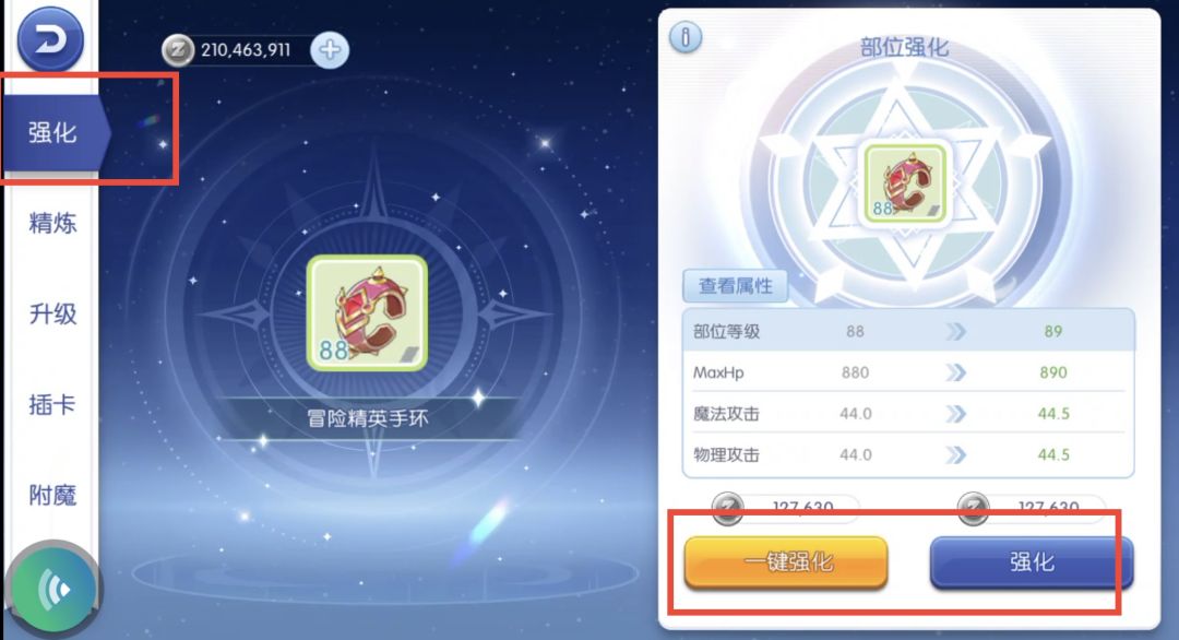 这个扫荡完就有一身基础装备,现在我们装备一身穿好,先点武器强化,强化自己的武器部位和饰品部位到自己的最高等级。之后升级都要来补到最高等级。