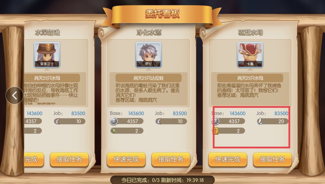 解锁完虎王冒险,换上冒险精英装备,选择物理攻击和暴击伤害的装备。打开课题收取奖励,此时把JOB药水吃到40级,我们可以去转职了。