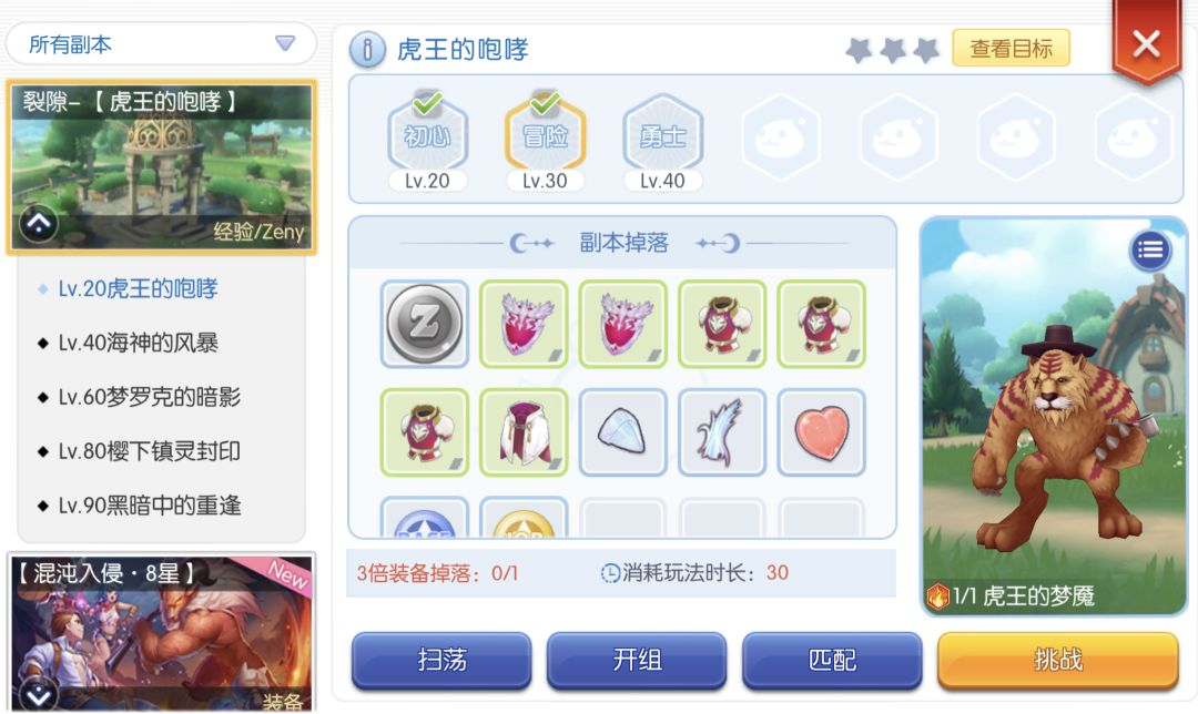 接着做裂隙任务,点匹配,和机器人打过虎王冒险。扫荡几次,活动时间用完。