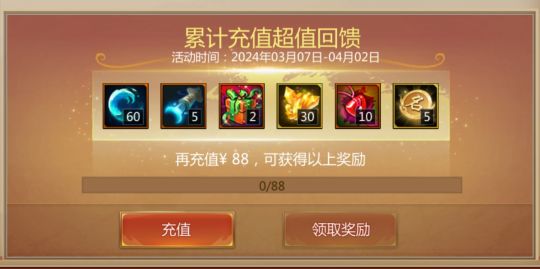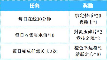 ①累计在线5分钟可获得月之匙(3天)*2、绑定梦币*200、橙色幸运符(7天)*2、兵粮卡*2