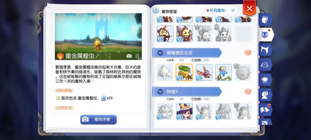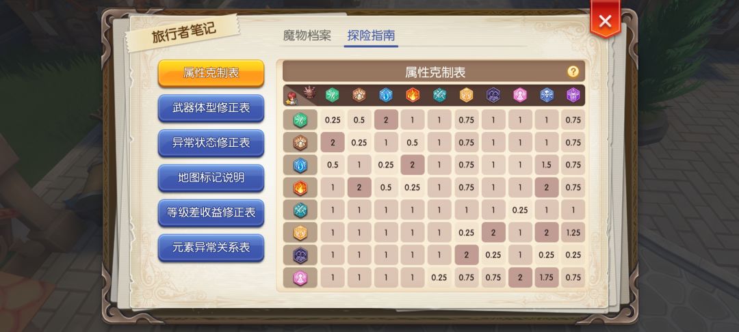 笔记里还有一些其他基础知识,这里不多做介绍,有不懂的可评论区留言我们知道了属性克制关系,那么还需要知道打的怪是什么属性,我们只需要杀一只就可以冒险手册查看了,如下