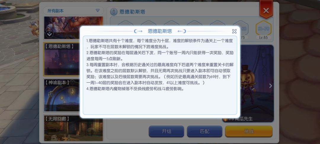 还有一点就是“电梯”依旧是在的,萌新玩家可能不知道什么是电梯,大家觉得第一周爬塔有很多小怪很恶心吧,“电梯”就是当队长上一周爬过这个层数的塔,那么他开的副本,进入是没有每层的小怪的,只有mini和mvp层的怪
