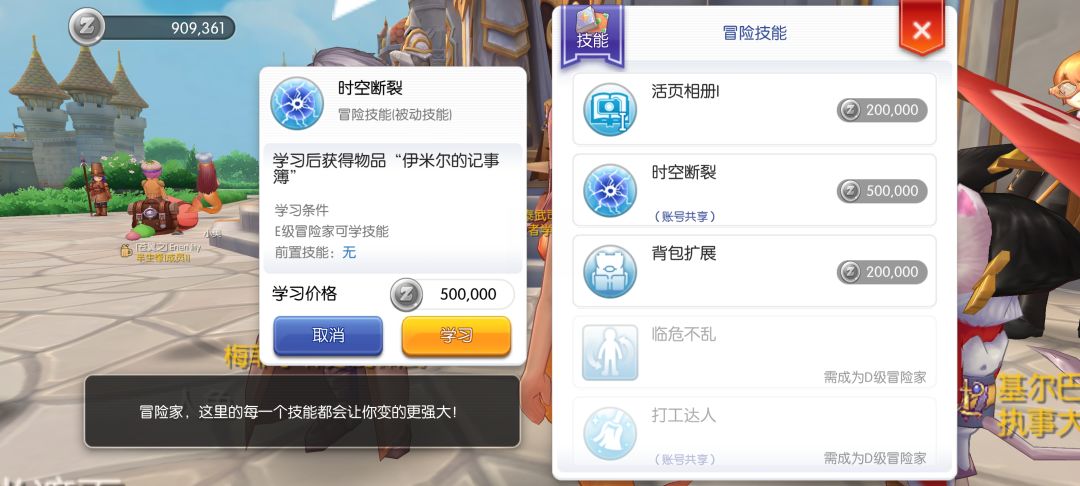 挂机结束之后,如果没什么事做,就尽量去提升冒险等级,包括但不限于,做料理,拍照(景点,魔物),提升冒险等级以提升冒险家等级,从而解锁冒险家技能,比较有用的冒险家技能分别是时空断裂(E级冒险家解锁)