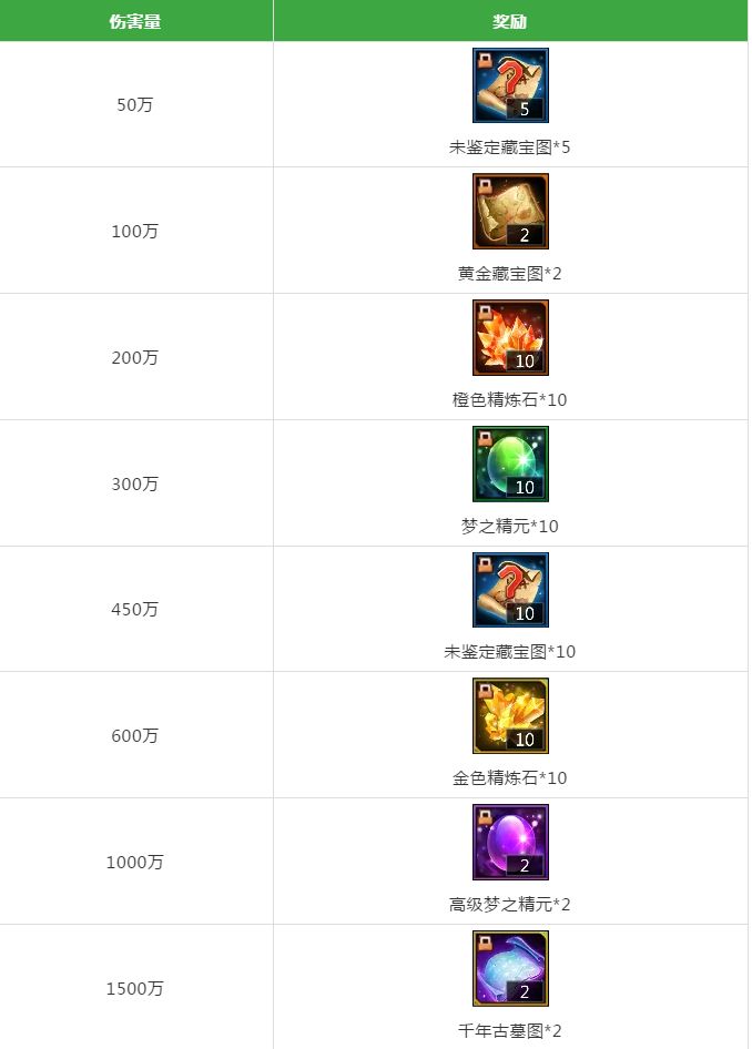 奖励当个人对世界BOSS伤害达到一定值时,可以在游戏里领取奖励,输出越高,奖励越丰富哦!对世界BOSS造成的所有伤害都会计入累计值。