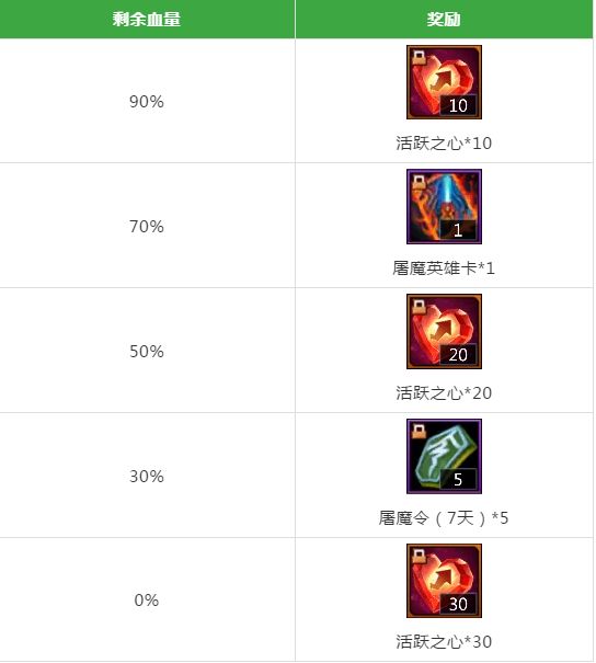 全区伤害奖励当本区世界BOSS剩余血量达到以下值时,全区玩家可获得丰厚在线奖励。(等级达到11级才能领取)