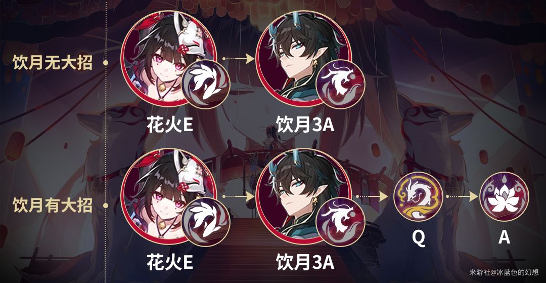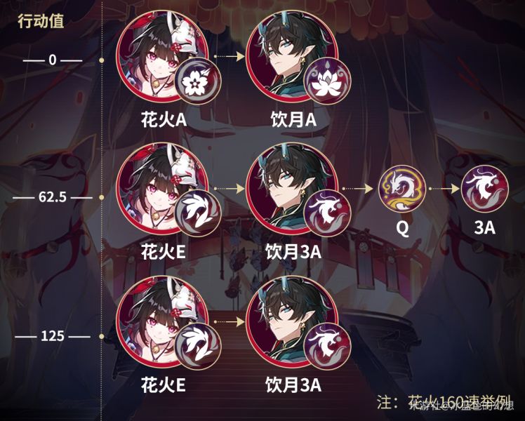 这样的轴最简单,有【等价交换】的辅助基本上就是花火两动饮月就能开一个大招,搭配罗刹战技点妥妥够用。实战战技点有多就可以让饮月多打一个3a。