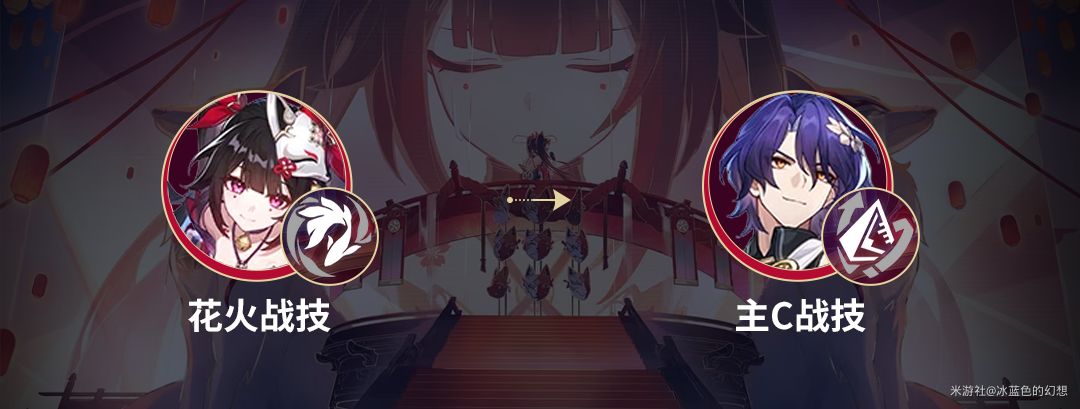 此时只要花火一直用e拉主C,那么主C的速度就完全等效于花火,花火的暴伤buff也是完全覆盖主C的。