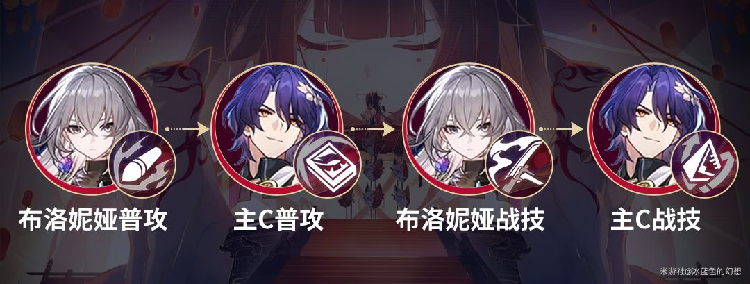消耗战技点0,主C每轮行动两次,打出一个普攻和一个战技,共回能50点。布洛妮娅每轮行动两次,回能50点。