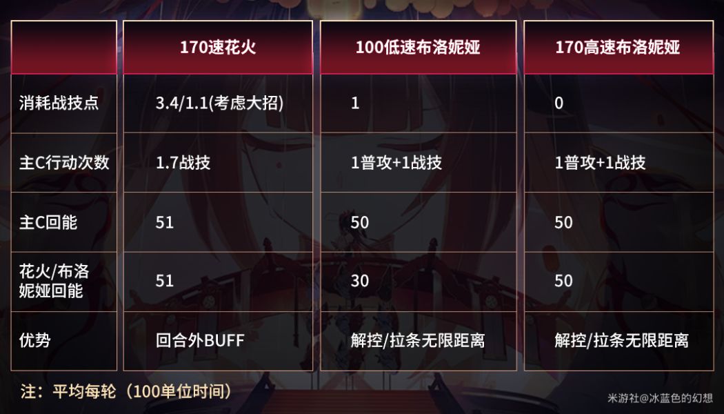 实际上,对于一个100速度主C,一个轮(100单位时间),前者只能打出一个布洛妮娅循环。而一个170速度的花火,在一个轮中就可以打出1.7个花火循环。