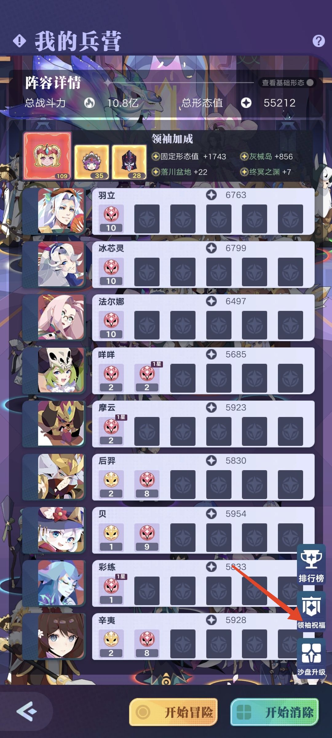 抽完卡,阵容怎么搭配呢?我的理解是,谁抽的最多星最高上谁,推不动再换人,勤换才能推的远,我推到82图了,还没看过伙伴技能,全靠工会大佬给配了套先机阵容,然后自己东拼西凑了套魔力阵容,换着推,所以7天争榜期间,有自己对伙伴的理解最好,没理解莽也行(莽村李宏伟,推图全靠胆子大)。推图的时候建议冒险和剧情换着推,左下角的任务一定要做,给的资源很多,沙盘记得及时升级,沙盘核心不建议买,副本、赛季、英雄试炼都能打到,如果你是肝帝,剧情里的英雄试炼7天内必打,给的资源很可观,网上有大佬视频攻略,抄作业即可。