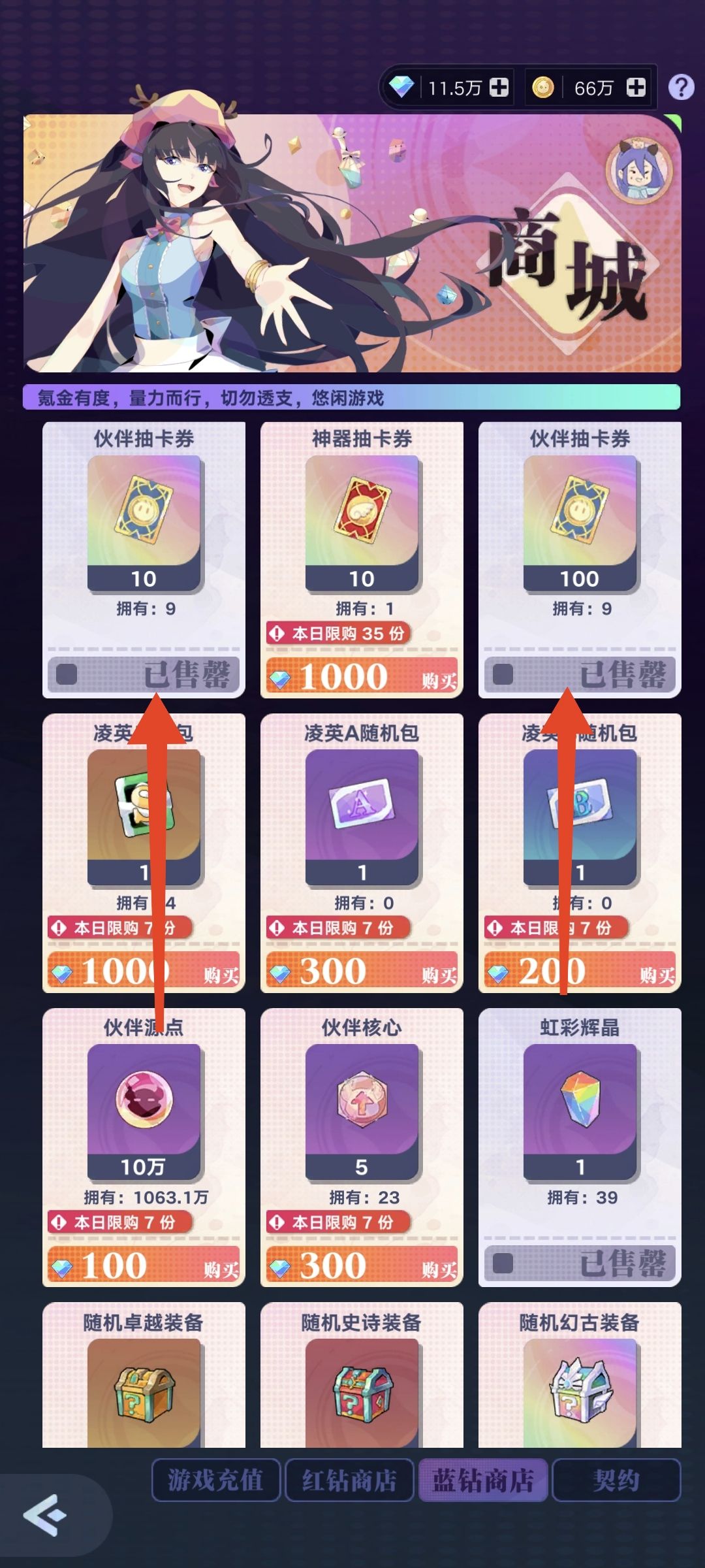 商店必买项,五折伙伴抽卡券、虹彩结晶、变异命石、高级选召券,前期伙伴没有大部分SS2星前,五折伙伴券性价比超高。虹彩结晶是伙伴升“S”时使用的,变异命石可以镶嵌提升战斗力。高级召唤券特别重要!冒险22-50后,会出领袖系统,这个东西会大幅增加形态值,让战力蹭蹭往上升,推图哗哗往前走,高级选召券能招出绿色领袖,绿色二合一成功的话是蓝,蓝合紫,紫合金,金合红,继续合是幻古,傻瓜式合成操作。形态值高了后打副本也好打很多。
