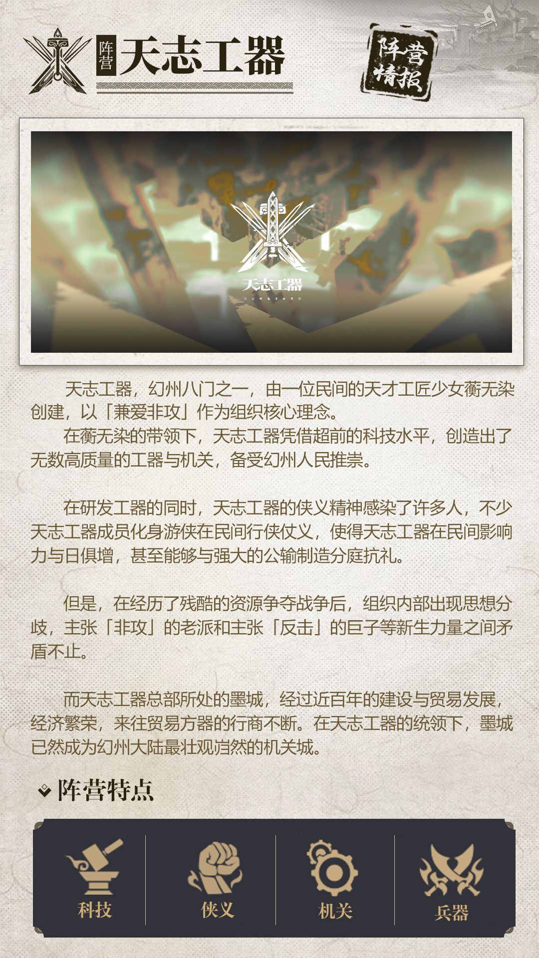 »»《启明幻歌》中有八大阵营设定,分别为「天志工器」、「万物方略」、「稷下学宫」、「东泽贤市」、「百事楼」、「公输制造」、「陶朱商会」和「神州玄术」««