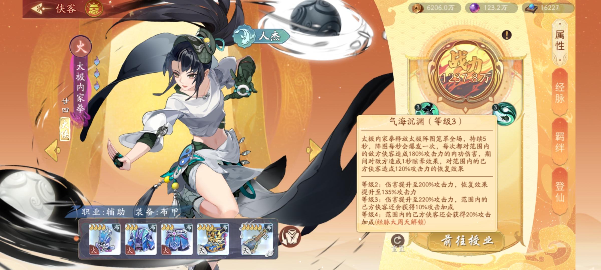 气海沉渊:太极阵图笼罩每次都对范围内的敌方侠客造成180%攻击力的内功伤害,期间对敌方造成1秒眩晕效果,对范围内的己方侠客造成120%攻击力的恢复效果。