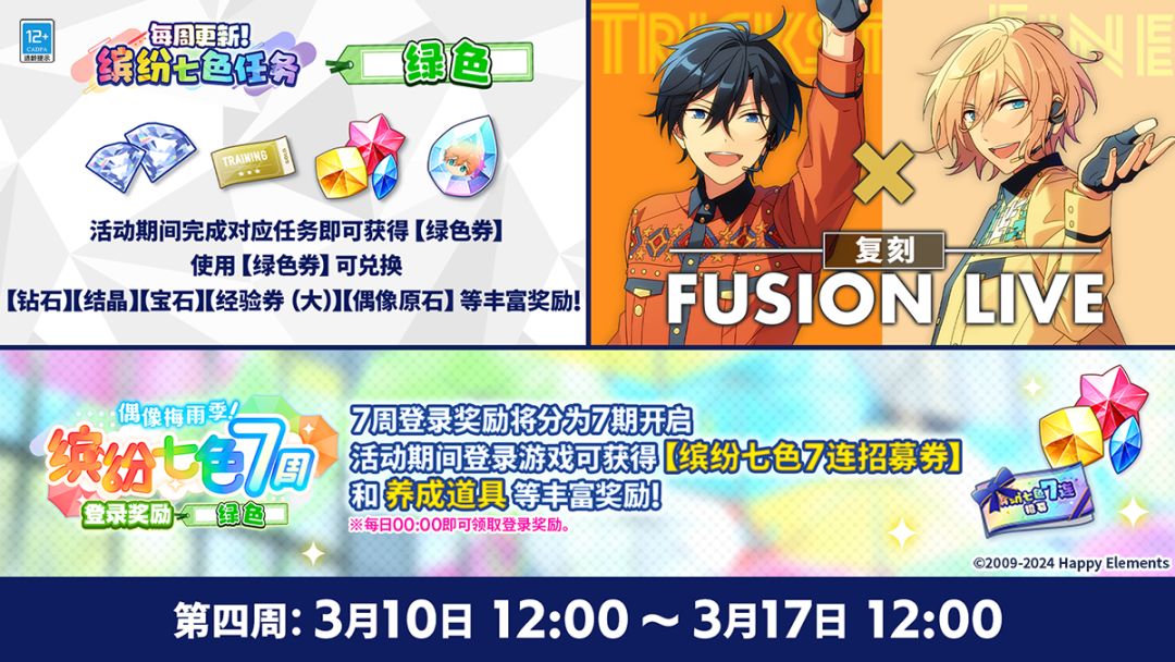 ▷活动期间完成对应任务即可获得【绿色券】,使用【绿色券】可在【缤纷七色券兑换所-绿色兑换所】内兑换【钻石】【结晶】【宝石】【经验券(大)】【偶像原石】等奖励!