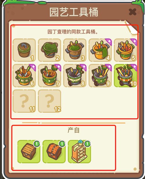 上方图示的便是点击信息后显示的面板信息,上半部分说明了“园艺工具桶”一共有12级,11、12级未显示的图标表示暂未合成喔;下半部分说明了“园艺工具桶”是产自哪里,什么途径可以获取来以此升级。