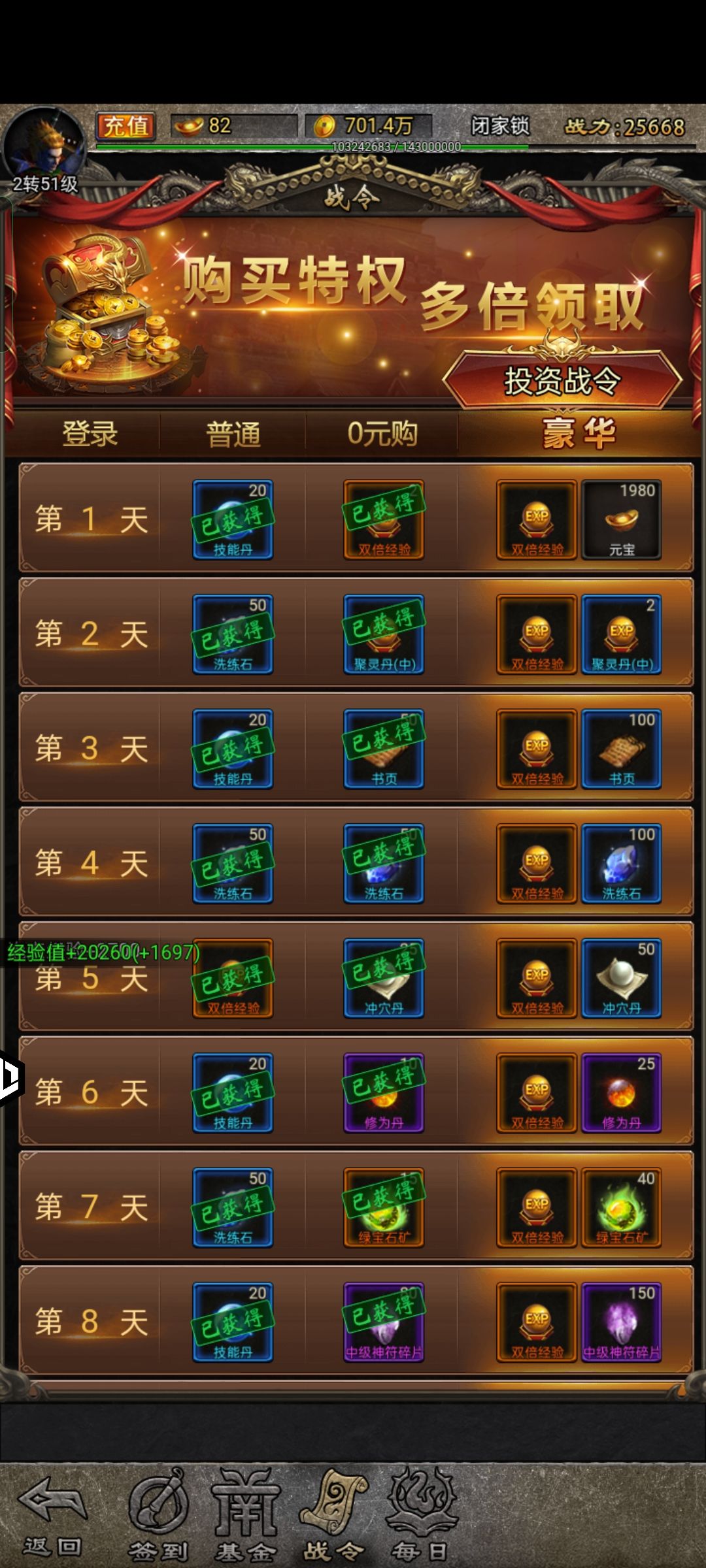 最值得购买的就是图三我发的那个 福利里面的战令,可以存元宝买,只要一直买还是合适的元宝可以全部返回来还给很多材料 适合白嫖党,不要乱花元宝前期,游戏可以挂机 游戏下线也会有经验,这就很好,不会像一般传奇一样要24小时在线!当然肯定是在线时间越长越好