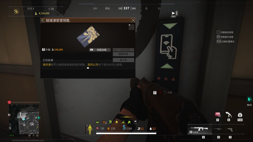 本期攻略为主要搜金线路,药剂方面建议携带阿托品注射器,力量增强针剂,出金区域比较分散,且非常中,需要增强耐力和避免中毒。在本期的路线中,建议携带钥匙扣或卡包,并携带以下钥匙: