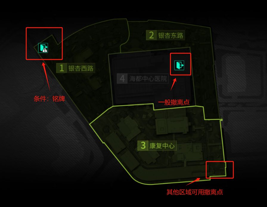 搜索差不多,就可以就进从撤离点撤离,海都的撤离点很少,如果左上角铭牌撤离点可用,最好使用左上角铭牌撤离点,但是一般图方便就去中心医院楼顶撤离。