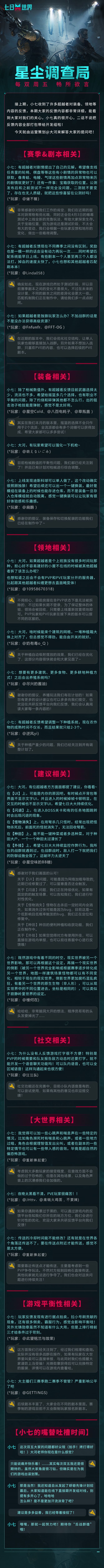 武器流派太少?赛季剧本太单调了?独狼怎么获得高级资源?还有种植、社交、领地建筑等等,简直是全方位对开发组进行“严刑拷打”,小七也捏一把汗(拍案叫绝)!