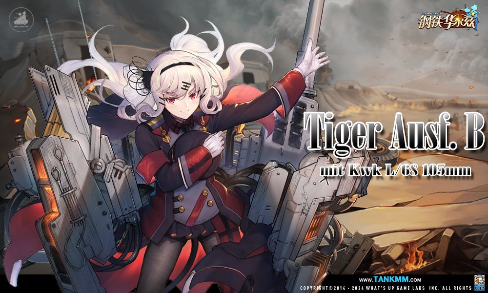现在可以确定,这台升级车也是一辆N6级的虎王没错了,只不过为了和现有虎王区分开,而选择了105炮的版本!至于为什么会准备第二台N6的虎王呢,不知道现阶段是否还有经历过2016年贴吧 “虎王撕币风波”的骨灰级指挥官啦。当时不少玩家对于刚公布的N6级虎王的立绘表示不满,他们认为虎王这种大名鼎鼎的重型坦克,应该采用御姐的形象!!不应该由一个带着娃娃的白毛萝莉来驾驶。除此之外,游戏早期老策划对于钢舞姬的属性控制相当严格,导致N6虎王的部分属性没有达到德棍们的心理预期,因此也趁着这个当口,在贴吧撕了个昏天黑地!所以38女士为了平息风波只好答应玩家们会再推出另外一辆N6的虎式坦克,而驾驶员就选择了人气不错的虎式坦克索菲。只不过105虎王的绘制进度很慢,等到交稿时,风波早已平息,且玩家们都已进入使用了主战坦克的世代了。38女士只好默默雪藏了这辆105虎王。