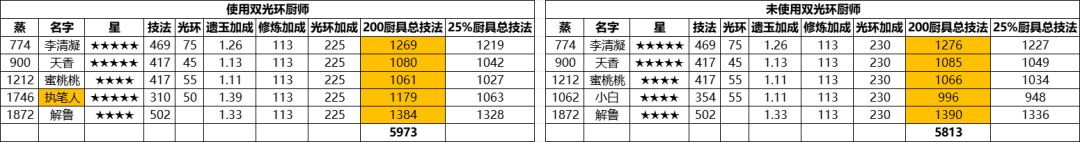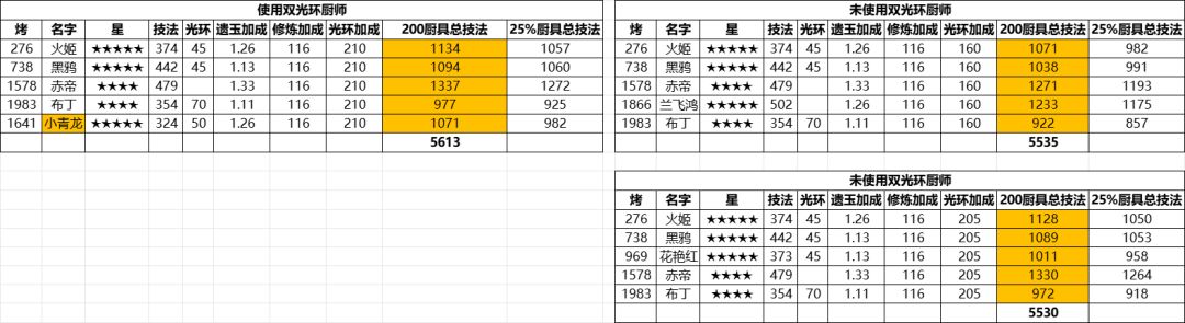 1、名字橙色背景代表厨师的光环有2种加成,给出了不用他们的第二种替代方案;