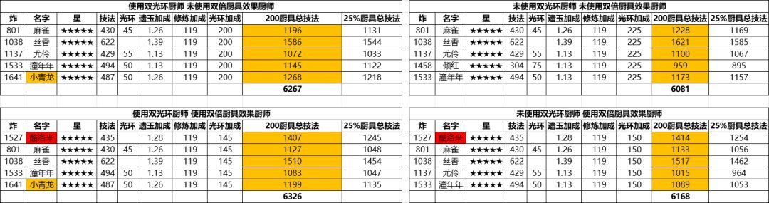 2、名字红色背景代表厨师修炼为双倍厨具效果,给出了不用他们的第二种替代方案;