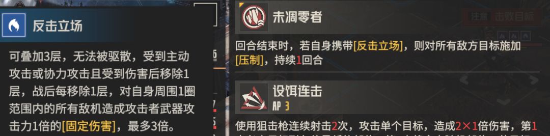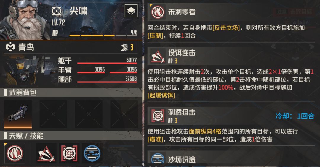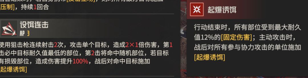 狙击枪技能,两连发,必中最低耐久部位,躯干耐久最低时需要注意;此技能还会附带的起爆诱饵状态,使我们行动结束后所有部位受到固定伤害,还会蔓延到协力友军身上,但是可以驱散