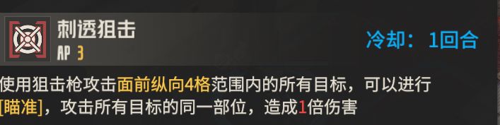 狙击枪技能,对面前一列4格的范围造成一次伤害,比较常规