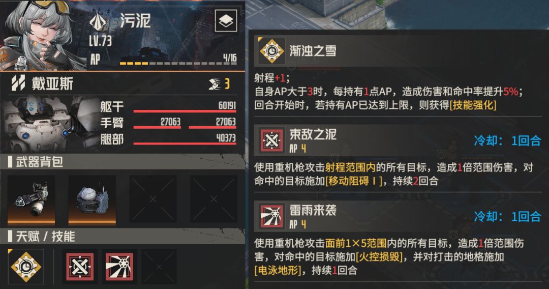 束敌之泥:重机枪技能,攻击范围为重机枪全部攻击范围,造成范围伤害的同时施加降低移动力效果,比较常规