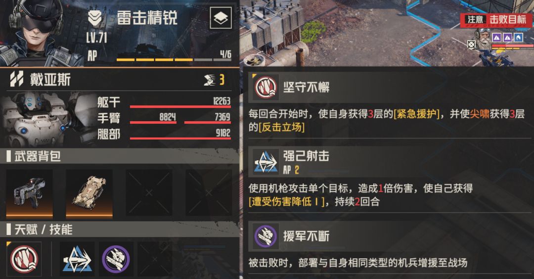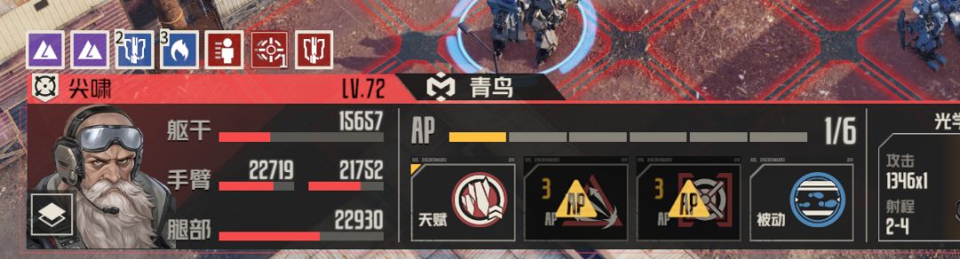 由于boss的狙击手类型和反击力场的效果。本关格斗机师是比较好的选择,而由于需要6回合完成,还要消灭旁边的头目,并且只能上场4个机师,输出会显匮乏,所以攻击boss的时候最好需要能够直接攻击boss躯干,避免输出分散。而对于旁边的头目,需要由一个火力足够的突击手处理。