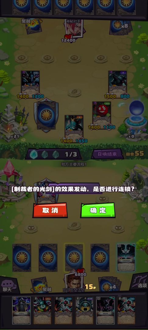光剑令对方三回合不能攻击,如果对方继续铺场,配合使用反射镜和闹钟,能造成一换多的效果。如果不铺,我们可以尝试铺场进攻。