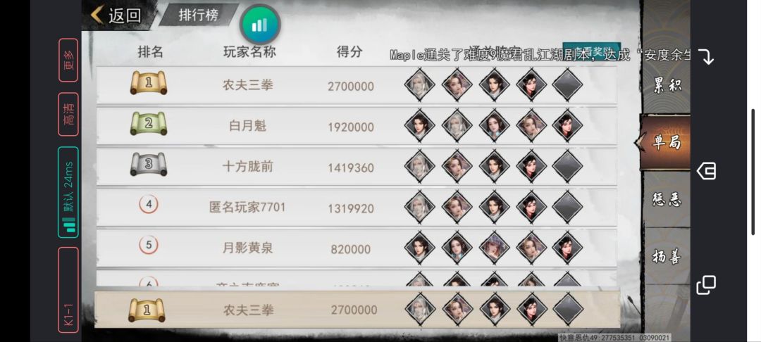 阵容:云烟霞(+9,速度2W2+),龙皎皎,借(+10,速度,速度2W+,内劲12W+,四内劲卷轴下),许璇薇(+9,速度1W9+,真气1170W+),苏明玉(+9,速度1W9+),凌乌衣(+10,速度1W4+,天赋+30%速度)