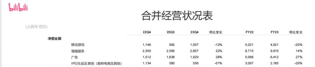 B站主要包含了四大业务,分别为游戏业务,增值服务,广告业务,IP衍生品及其他。2023年全年: