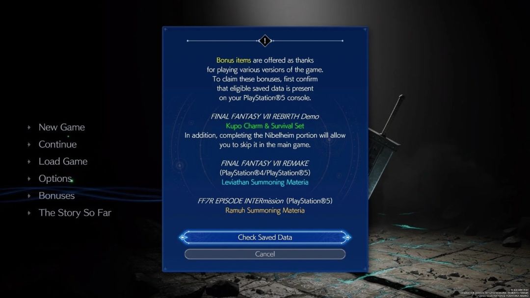 如果你打完了《最终幻想 7 重生》的尼福尔海姆试玩 Demo,你就可以在正式版的第一章中跳过一段内容,并获得一些特典物品。如果你的主机上有《最终幻想 7 重制版》和尤菲篇 DLC 的存档,还可以获得更多奖励。获取方法如下: