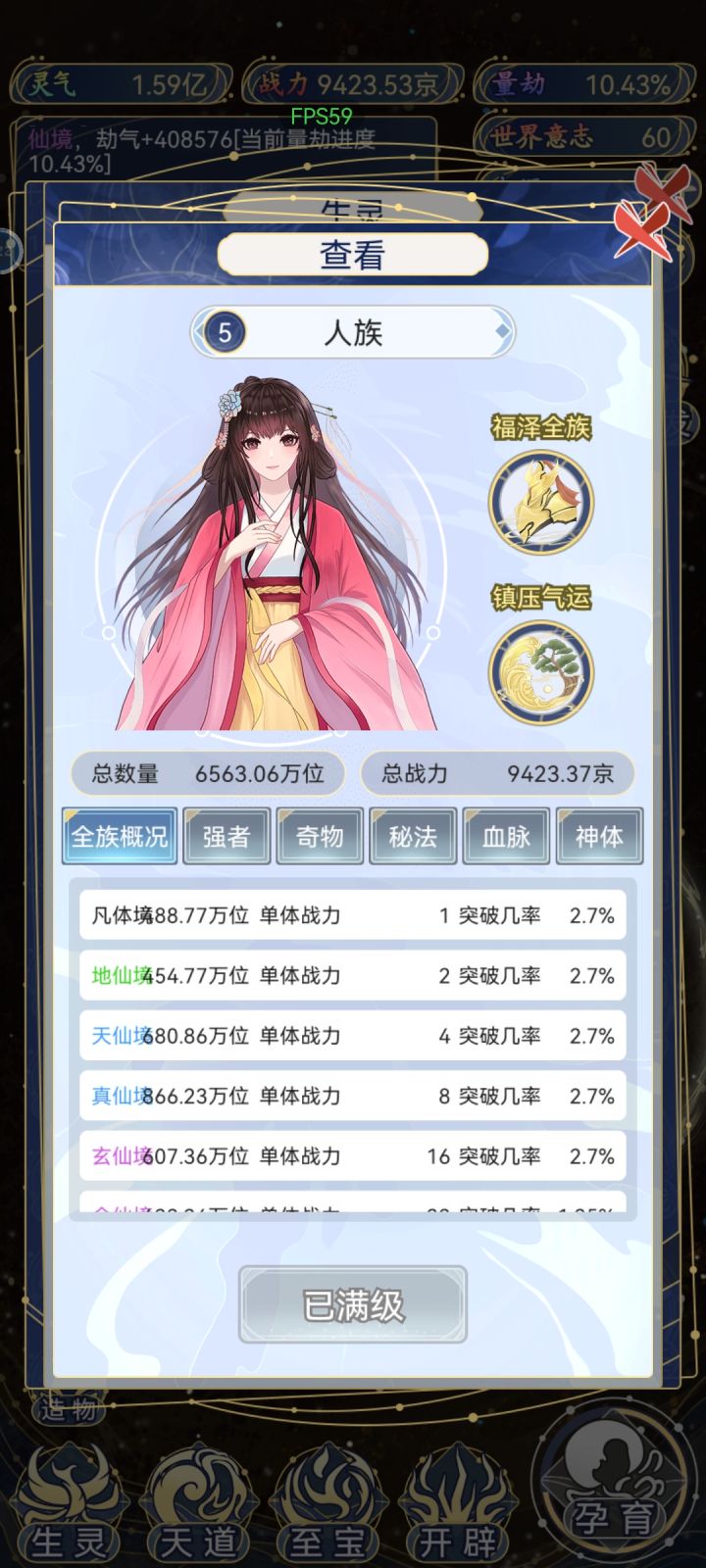 我突然发现这儿的境界能和吞噬星空的境界划分完美契合,凡体境对应吞噬星空中的学徒级,地仙境对应行星级,天仙境对应恒星级,真仙境对应宇宙级,玄仙境对应域主,金仙境对应界主,太乙境对应不朽,大罗境对应宇宙尊者,大罗巅峰对应宇宙之主(法则之主),准圣对应宇宙最强者(真神),准圣巅峰对应虚空真神,圣人对应永恒真神与混沌主宰,圣人巅峰对应神王与浑源境。不同等级的种族因为出生血脉不同,导致初始境界也不同,比如吞噬星空中大部分普通种族(比如地球人族只是九级血脉)一出生就只是学徒级,而少数拥有高等血脉的特殊种族(比如蛮卡星人是一级血脉)一出生就是行星级,金角巨兽一出生也是行星级,吃完蛋壳就变成恒星级了。这在这个游戏里也有完美体现,普通种族(比如人族)一孕育出来只是凡体境,而且高等种族(比如古仙族)一孕育出来就是金仙境,而且高等种族同境界的初始战力也比普通种族的高,比如人族一个金仙初始战力仅为32,而古仙族一个金仙初始战力就达到6144,足足是人族的192倍。而且吞噬星空中各境界间有比较大的跨越节点在该游戏中表现为各境界间的颜色区别,比如凡体境到地仙境,对应吞噬星空中的境界跨越为学徒级到行星级,那是一种本质的跨越,颜色从普通的黑色变成了绿色;然后便是地仙境到天仙境,对应吞噬星空中的行星级到恒星级,这两个境界在前期的表现中也有非常大的跨越,颜色从绿色变成了蓝色;再然后是真仙境到玄仙境,对应吞噬星空中的宇宙级到域主,这之间的跨越也非常大,宇宙中几乎没有大规模的域主级奴隶,就是因为达到域主以后灵魂可以离体,奴隶芯片不会起作用,而这也能从侧面反应出这两个境界之间的巨大跨越,颜色从蓝色变成了紫色;接着是金仙境到太乙境,对应吞噬星空中的界主到不朽,这两者之间也是生命层次的跨越,界主级还有寿元限制,普通界主大概是一千纪元,不朽级没有寿元限制,或者准确点说不朽级也有寿元限制,但是是和宇宙寿元一样,天地同寿,可以活一个宇宙轮回时代,一个宇宙轮回时代大概是10081亿纪元,吞噬星空中一个纪元是10081年。(插一句题外话,10081这个数字特殊之处在于10081是球体拼面比例,任何正球体至少需要10081个面才能构成。所以这个数字也被称为宇宙中的完美极限。)颜色从紫色变成了金色。