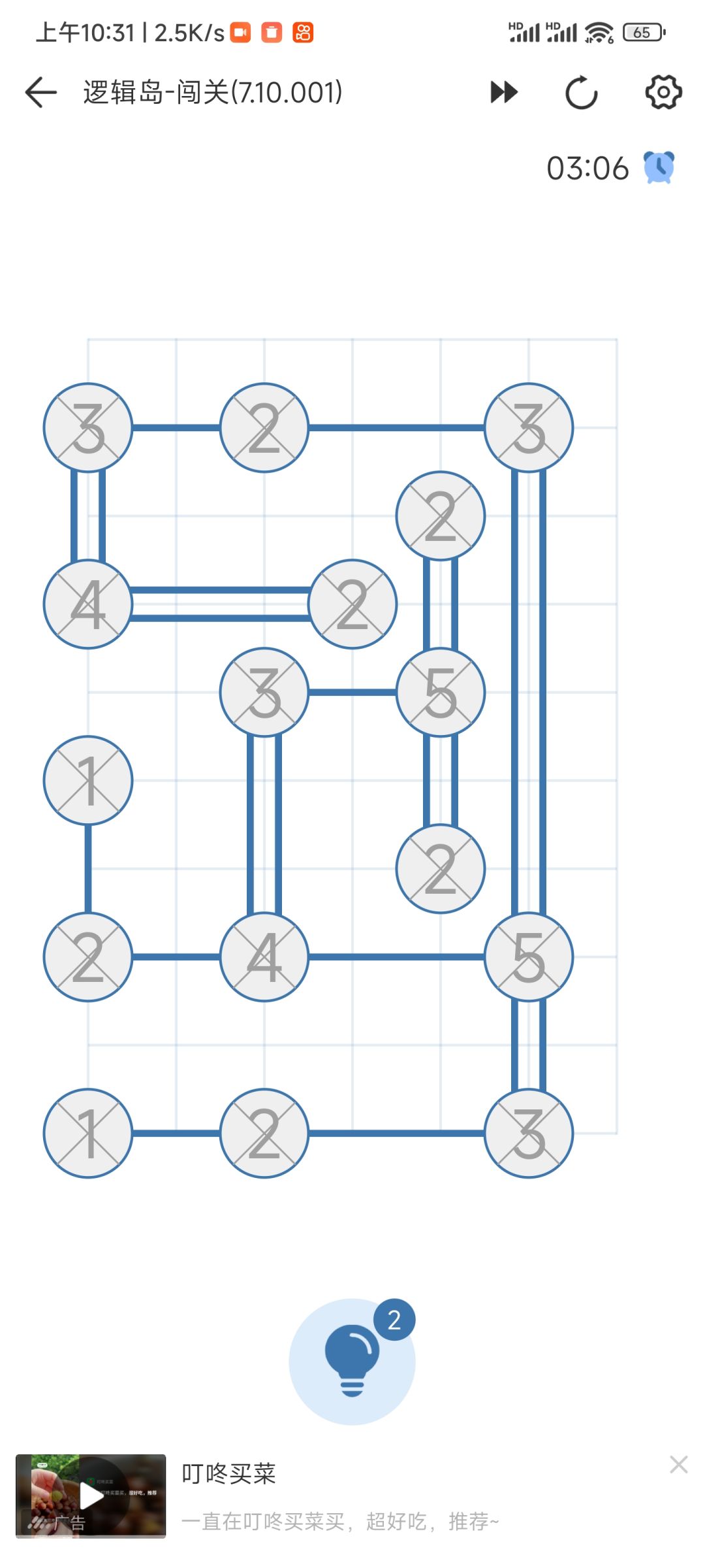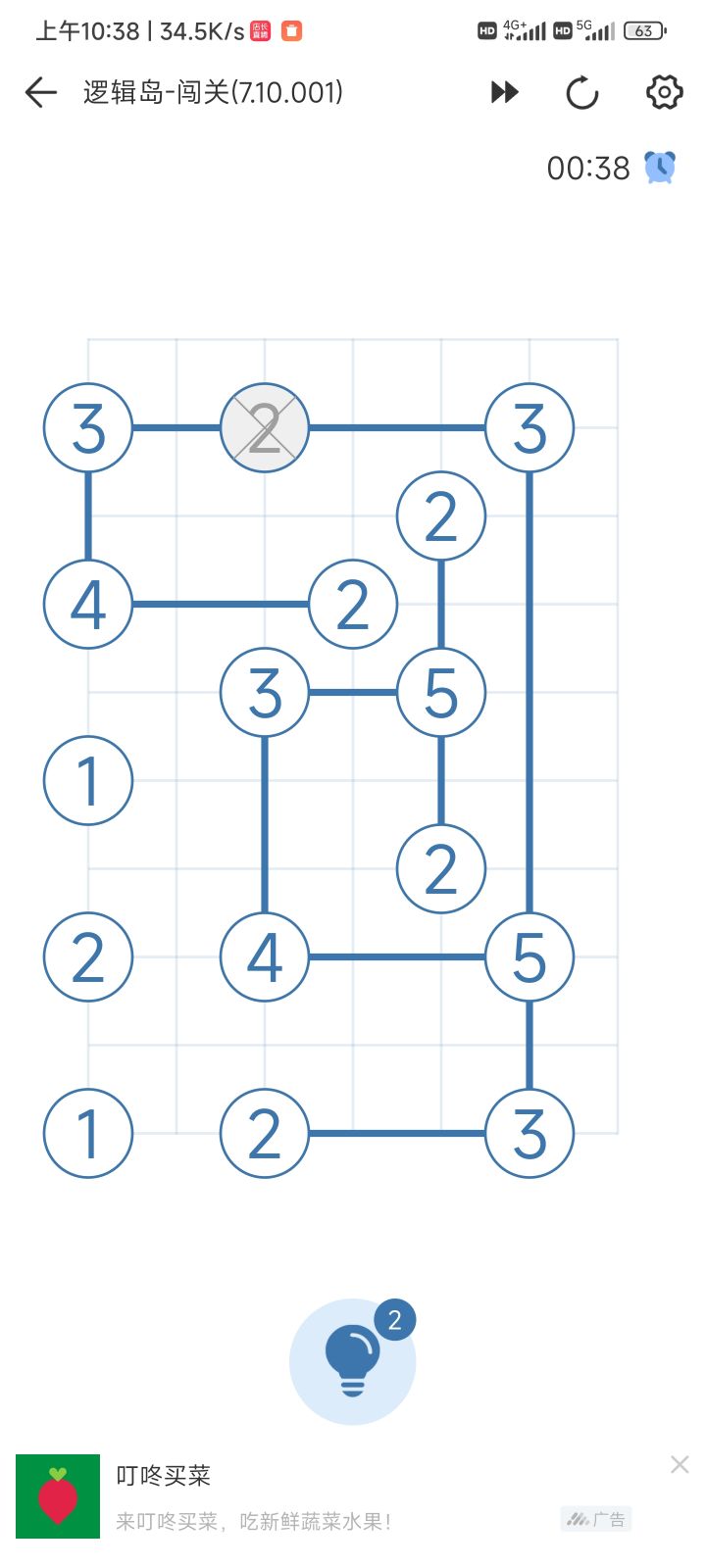 根根据圆圈里面的数字,每个方向只能连两根,最后不能让孤岛独立,由此就可以比喻,圆圈里面的是数字5,它可以连接3个点,(数字3,数字4)就可以按连接两个点算