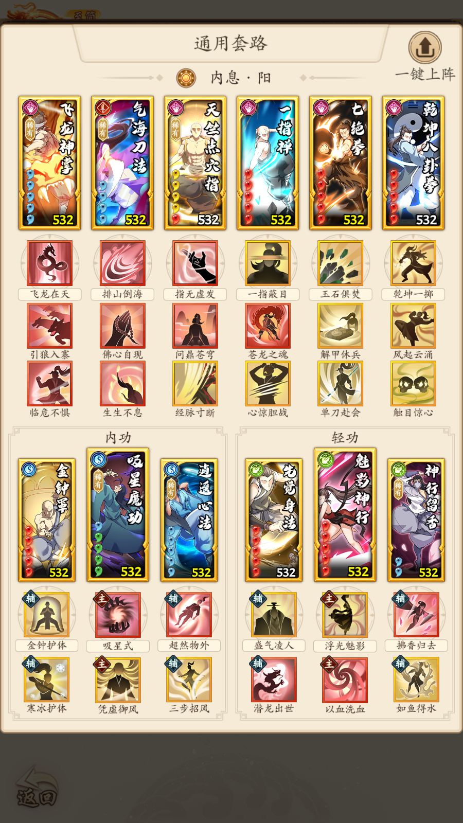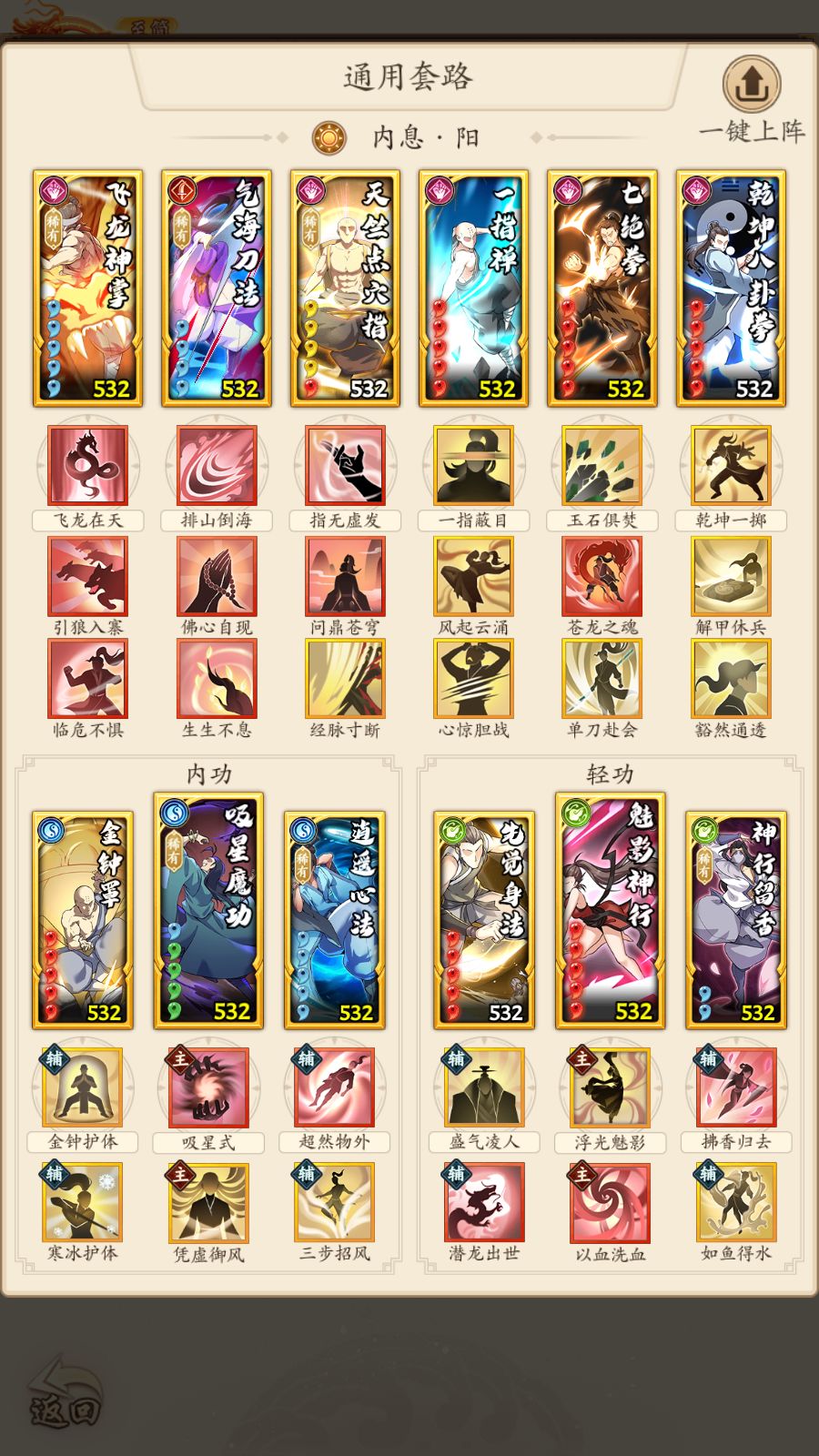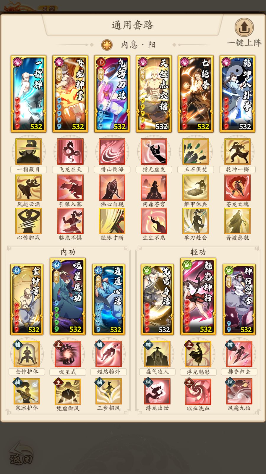 注解:可以看到,空了很多格子,我故意的。什么意思呢,就是说上面已经有的招式就是必须要的招式(要优先搞出来),至于空格的位置,就有什么用什么,不必拘泥。开局主养魅影,之后养先觉,再之后就石破。当石破勾远超神行留香的时候,为了抢先手就可以换掉留香了。第二个养先觉是为了可以灵活转型。
