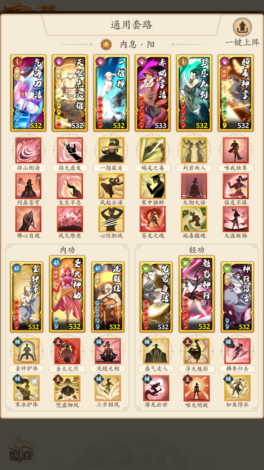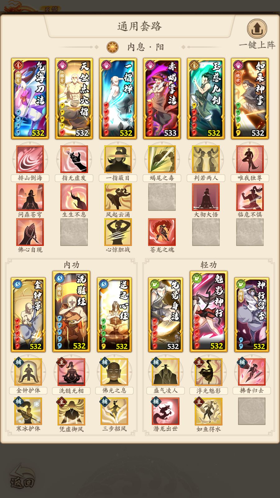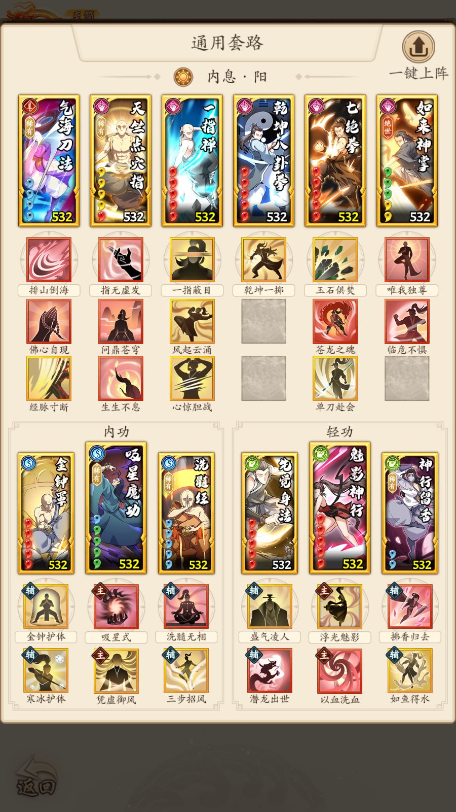 注解:可以看到,空了很多格子,我故意的。什么意思呢,就是说上面已经有的招式就是必须要的招式(要优先搞出来),至于空格的位置,就有什么用什么,不必拘泥。开局主养魅影,之后养先觉,再之后就石破。当石破勾远超神行留香的时候,为了抢先手就可以换掉留香了。第二个养先觉是为了可以灵活转型。