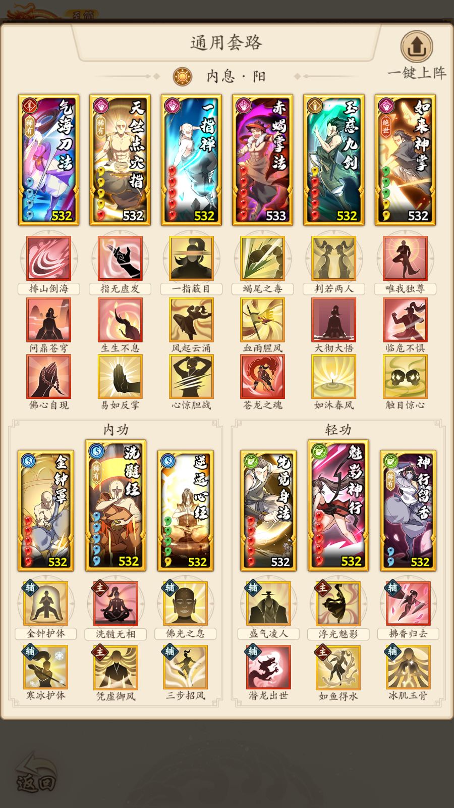 1,(开篇阶段):上面也讲过如鱼得水了,因此开局,建议不用吸星内功,用主洗髓。为什么不用金钟石破呢,因为前期武学勾都不高,那么这种情况下就选择效果更好的洗髓来主运。