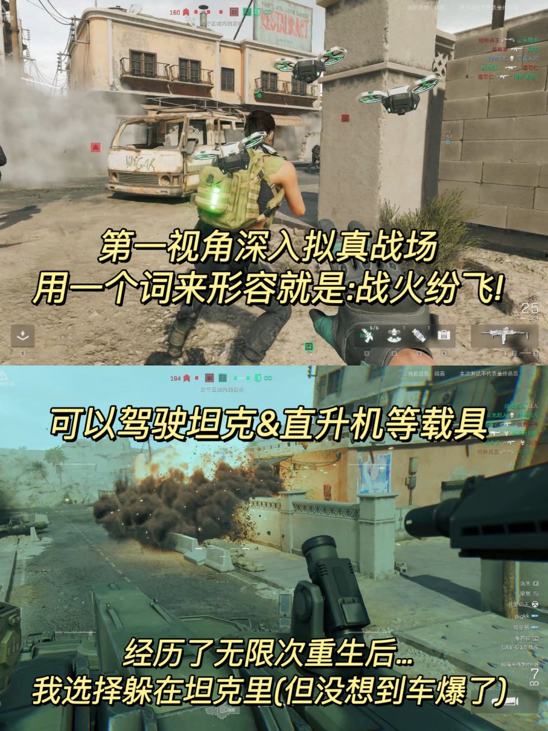 【全面战场】32V32大型战场攻防玩法,1:1复刻三角洲特种部队经典地图🗺️。该玩法可以4人组成小队,与其他28名玩家组成32人进攻方或者防守方,进攻方需要占领防守方所有据点视为获胜,同理防守方成功防守则视为胜利。这个玩法是我体验时长最久的,最大的感受就是:😨谁在打我?😨我怎么又死了?😨我躲在这也能被AOE吗???虽然战场上人数众多,时而烟雾弥漫,时而敌我不分,但是有一种曾经玩魔兽时指挥战场的爽感,谁懂!🚗在这个玩法中我们还可以驾驶多种载具,比如攻击艇、主战坦克、直升机和武装装甲车等等,海陆空全栖作战,第一视角体验瞬息万变的拟真战场!