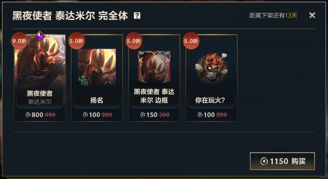 完全体礼包优惠不容错过!截止至3月21日,黑夜使者 凯隐、黑夜使者 泰达米尔、黎明使者 德莱文和黎明使者 阿克尚完全体礼包一并上架,还有不同的皮肤边框和专属表情。