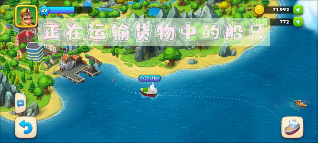 由于只有一艘船的运输效率低,我得再购买一只船去水果岛运货,以便在另一艘船的船舱上也能获得更多的水果。不过,我把小镇人口提升到2050个后,才能再次购买一艘船。