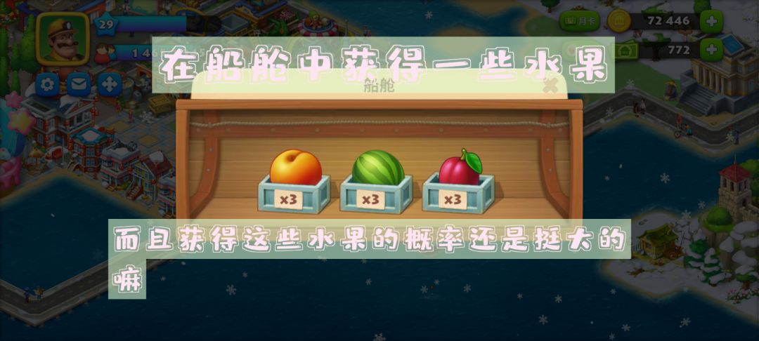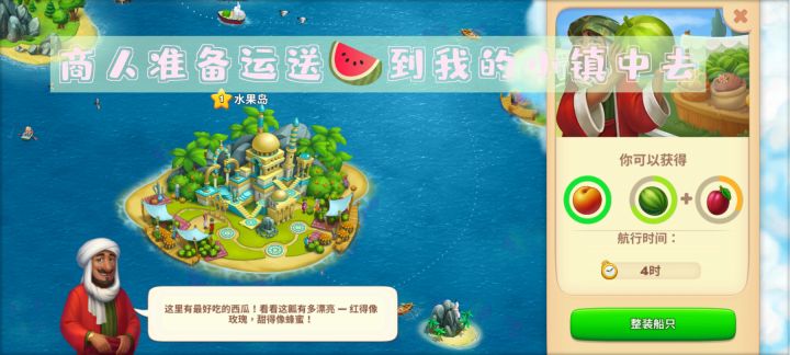 这位商人除了拥有一些西瓜以外,商人还特意准备了一些梨子和一些黄桃。我确定了这位商人的意见后,我就开始派一艘船到水果岛上运水果,不过我派一艘船之前,还要把一块铸锭放到船上,以便以更大的概率获得一些水果。除此之外,把铸锭放在船上后,还能获得一些宝箱奖励呢。