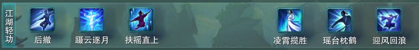 - 小轻功、江湖轻功:一般指扶摇直上、蹑云、左移【凌霄揽胜】、右移【瑶台枕鹤】、后移【迎风回浪】,不消耗气力值,常用于规避技能、短距离位移,或者滞空。